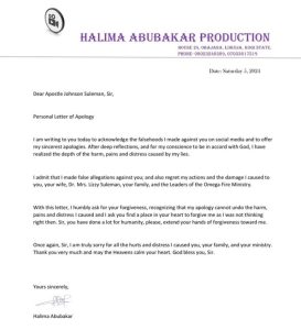 However, Halima Abubakar apologized to Apostle Suleman in a letter sent to the cleric.