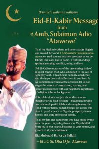 > “Eid-El-Kabir reminds us of the unwavering devotion of Prophet Ibrahim (AS) and the importance of humility, selflessness, and total submission to the will of Almighty Allah,” he said.