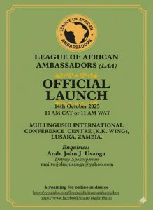 In a historic stride toward strengthening continental unity and diplomatic cooperation, the League of African Ambassadors (LAA) is set to hold its Official Launch Ceremony on Tuesday, October 14, 2025, at the prestigious Mulungushi International Conference Centre (K.K. Wing) in Lusaka, Zambia.