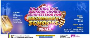 For some weeks now the Dr. Dk and Dr. Mrs. Shade Olukoya Choral Competition for secondary schools in Lagos state has been on going, this is an event that discovers raw singing talents across the state, this competition is held Throughout the 6 educational district of the state and has featured over 164 participants from all the Lagos state educational districts both online and offline, with 14 participants emerging as the finalist.
