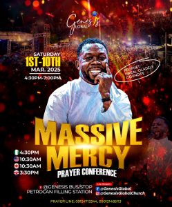 In a time where many seek divine intervention and breakthroughs, Genesis Global is set to host a powerful spiritual gathering, the Massive Mercy Prayer Conference. Scheduled to run from March 1st to March 10th, 2025, this highly anticipated event will take place at Genesis Bus Stop, Petrocan Filling Station, drawing worshippers, believers, and seekers from across the world.