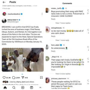 Ever since a press statement was made available that the EFCC has finally invited the sons of business mogul, Chief Razak Okoya, Subomi and Wahab for interrogation against the abuse of the naira in the viral video. According to the report, the duo is expected to report to the Head, Special Operations Team in Ikoyi, Lagos. Immediately after this report was made public, there was astronomic comments from Nigerians which were quoted as: