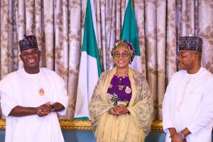 Pix: L-R. Kogi State Governor, Yahaya Bello, First Lady of the Federal Republic of Nigeria, Senator Oluremi Tinubu, CON and Kogi State Governor Elect, Ahmed Usman Ododo during a visit to the the First Lady. It was to present the certificate of return by the Governor Elect. It was an opportunity for the First Lady to admonish the Governor Elect Ododo to prioritize Women and Youth.