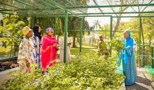 There after the first lady, Senator Oluremi Tinubu proceeded to her garden within the state house and harvested some fresh vegetables like Jute leaves, Okra and lemon grass among others for her guests.