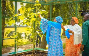 There after the first lady, Senator Oluremi Tinubu proceeded to her garden within the state house and harvested some fresh vegetables like Jute leaves, Okra and lemon grass among others for her guests.
