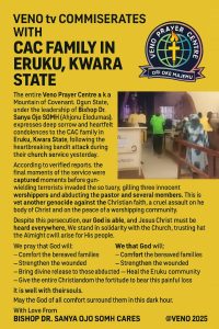 The entire VENO Prayer Centre a.k.a Mountain of Covenant, Ogun State, under the leadership of Bishop Dr. Sanya Ojo SOMH (Anjonu Eledumare), expresses deep sorrow and heartfelt condolences to the CAC family in Eruku, Kwara State, over the tragic bandit attack that occurred during their worship service yesterday.